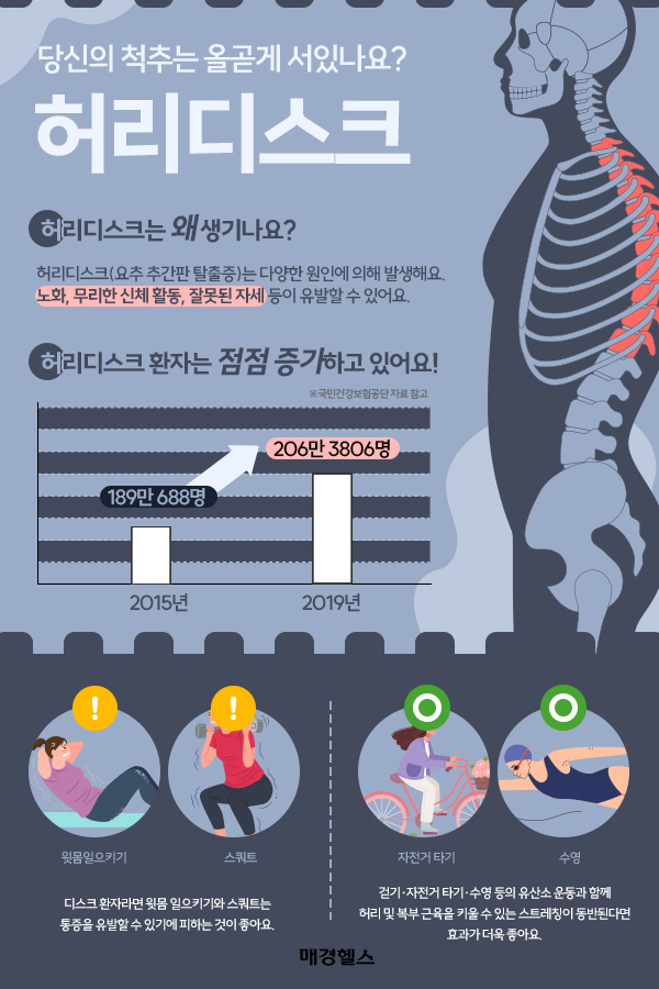 허리디스크는 척추의 인대와 디스크가 손상되거나 탈출하여 주변 신경에 압력을 가하는 상태를 말합니다. 이로 인해 통증, 저림, 둔함 등의 증상이 나타날 수 있습니다. 허리디스크는 일반적으로 나쁜 자세, 비만, 반복적인 스트레스, 유전적 요인 등으로 발생할 수 있으며, 이로 인해 일상생활에서 여러 가지 불편함이 생기기도 합니다. 특히, 운동 부족으로 인해 허리 근육이 약해져 있을 경우 이러한 문제는 더욱 심화될 수 있습니다.